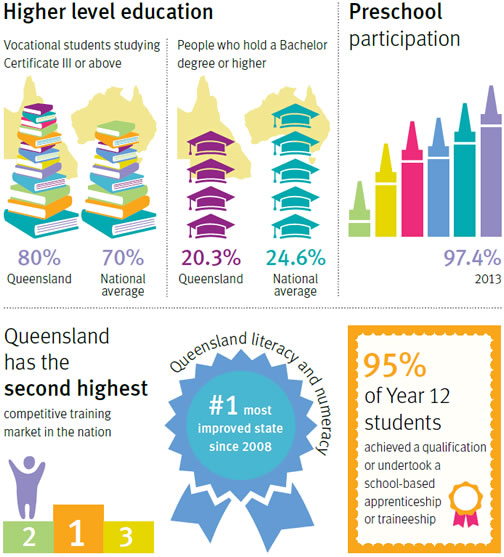 Queenslanders believe a quality education system is the launch pad for a rewarding life, meaningful career and innovative knowledge economy. Read more on page 19 of The Queensland Plan (PDF, 4.19MB).
