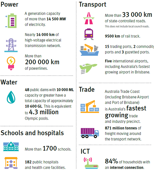 Our access to clean water, reliable energy supplies, communication technology and public infrastructure provides an enviable standard of living. Read more on page 75 of The Queensland Plan (PDF, 4.19MB).